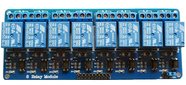 Module này gồm có 8 relay 5V có opto bảo vệ, có thể dùng để điều khiển bật tắt 8 thiết bị. Module này có thể sử dụng với Arduino hoặc các dòng vi điều khiển khác. Đây là loại relay kích ở mức thấp, tức kích ở mức 0. Nguồn điều khiển là nguồn 5V. Nếu muốn sử dụng cùng lúc 8 relay thì cần phải cấp nguồn ngoài 5V cho module, sau đó nối chân âm của nguồn ngoài với chân âm của Arduino.