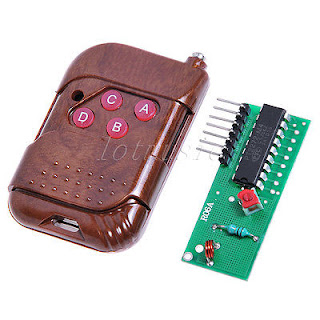 Đây là bộ điều khiển từ xa sử dụng sóng RF (Radio Frequency- sóng Radio) 315 MHZ, khoảng cách điều khiển trong môi trường không vật cản là 50 m. Bộ này gồm 2 module: module phát tín hiệu và module thu tín hiệu. Module phát có 4 nút nhấn (4 kênh- 4 chanel). Module thu có 2 chân cấp nguồn VCC (nối nguồn 5V) và GND. Module thu có 4 ngõ ra D0, D1, D2, D3, 4 ngõ ra này có thể kết nối với vi điều khiển.Khi nhấn nút trên mạch phát, ngõ ra trên mạch thu sẽ được kích lên mức 1.