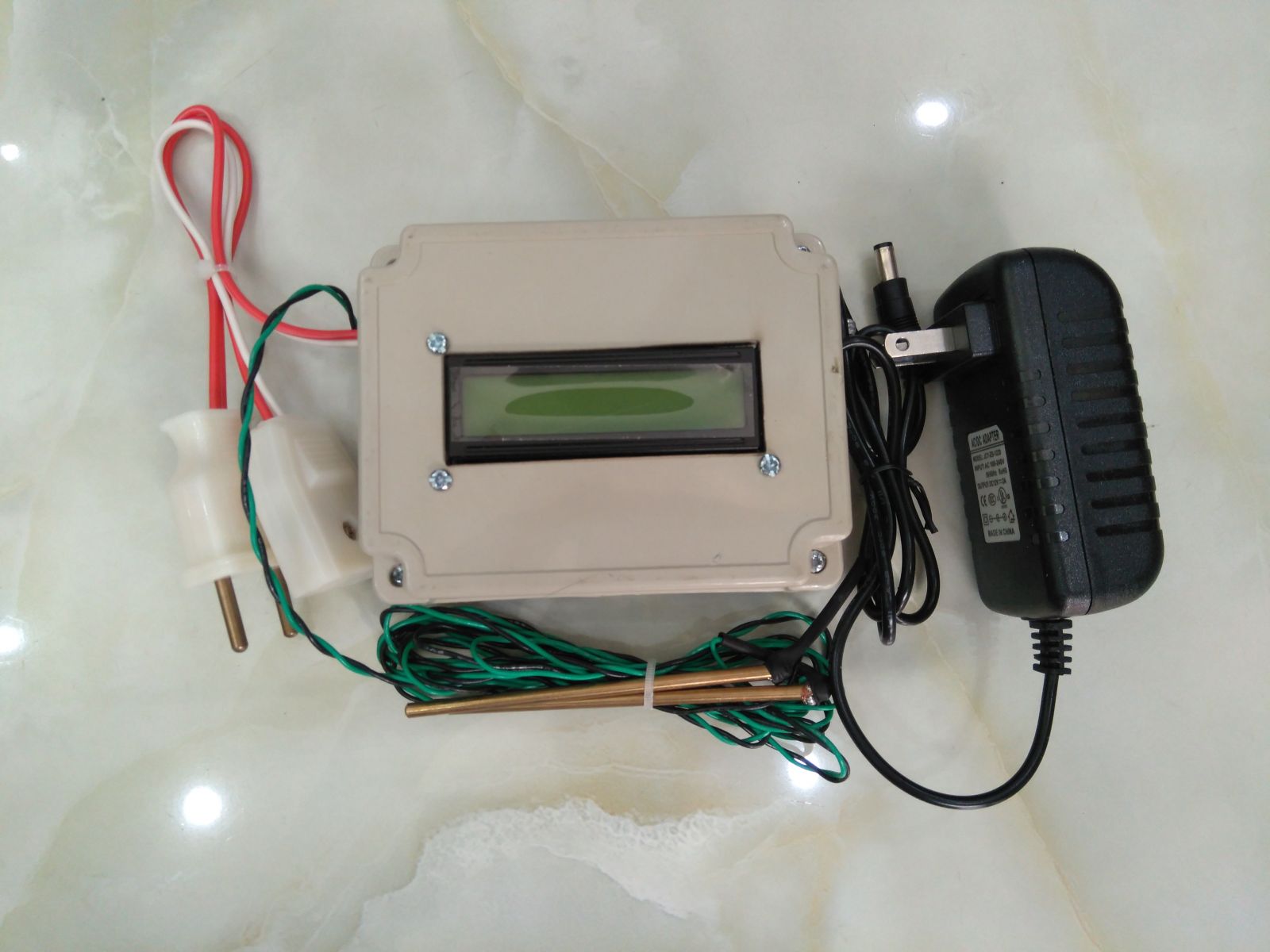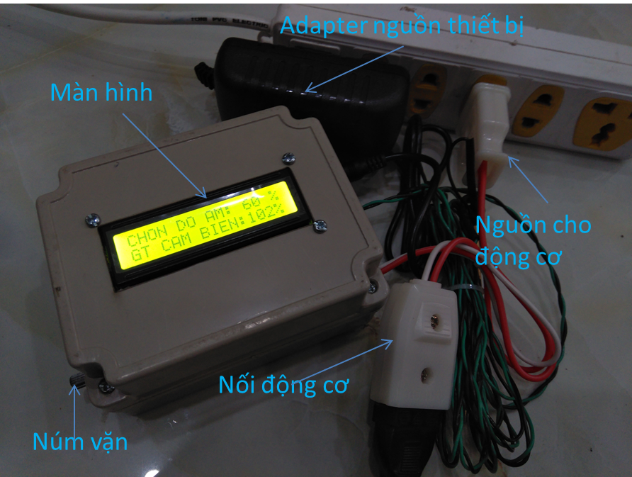 Thiết bị có một núm xoay để chỉnh ngưỡng độ ẩm để kích hoạt bơm, khách hàng có thể tùy chỉnh dựa vào kinh nghiệm thực tế của mình để chọn được ngưỡng mong muốn. Phích cắm điện được thiết kế sẵn cho máy bơm hoạt động. Công suất máy bơm không quá trực 500W, nếu muốn dùng bơm lớn hơn 500W thì phải dùng thêm khởi động từ để có thể chịu công suất lớn hơn. 02 thanh đồng trong thiết bị được dùng để cắm vào đất, sử dụng thanh đồng sẽ cho độ bền cao. Hình bên dưới mô tả cách đấu nối thiết bị với bơm.