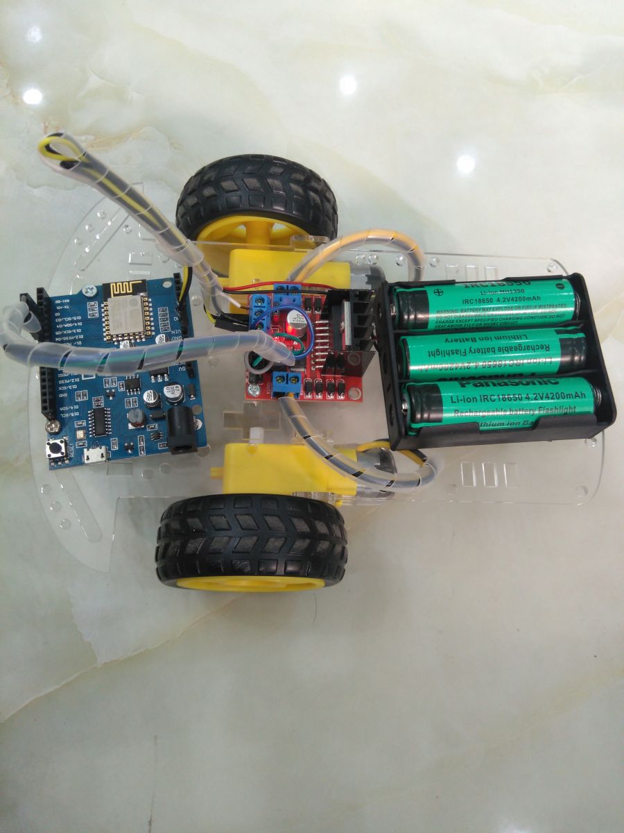 Shop Phú Hưng đã chế tạo thành công robot này vào ngày 12/04/2018. Robot được chế tạo từ khung xe, động cơ, mạch cầu H, và một mạch Wifi Wemos D1. Bạn có thể điều khiển robot từ bất cứ nơi nào trên thế giới miễn là bạn có wifi. Một giao diện điều khiển được thiết lập trên App Blynk , giúp các bạn có thể điều khiển thông qua điện thoại di động. Trên màn hình giao diện có thanh xác định vận tốc robot, một nút xoay để điều khiển hướng đi của robot, một nút nguồn để khởi động và môt nút giao diện tín hiệu thể hiện sự kết nối giữa robot và điện thoại. Có 3 pin sạc loại 18650 để robot hoạt động, một bộ sạc được tặng kèm robot.